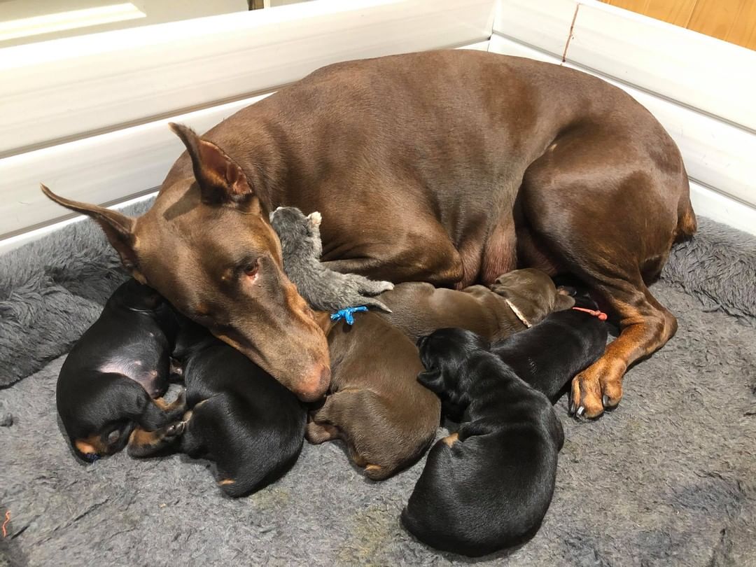 When Brittany Callan found a newborn kitten, apparently abandoned by its mother, she brought it home to her six Dobermans. One of them, Ruby, the mother, took on the kitten as her own, nursing it along with her other babies.