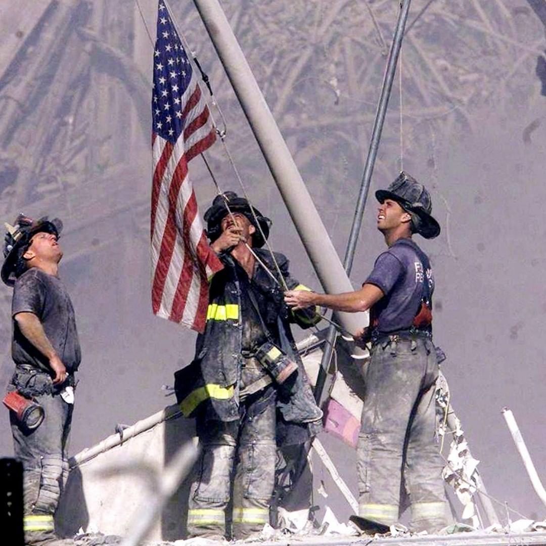 In the middle of what he described as a "war zone," Franklin saw firefighters "fumbling" with an American flag near where the Twin Towers had fallen and fired off a burst of photos.