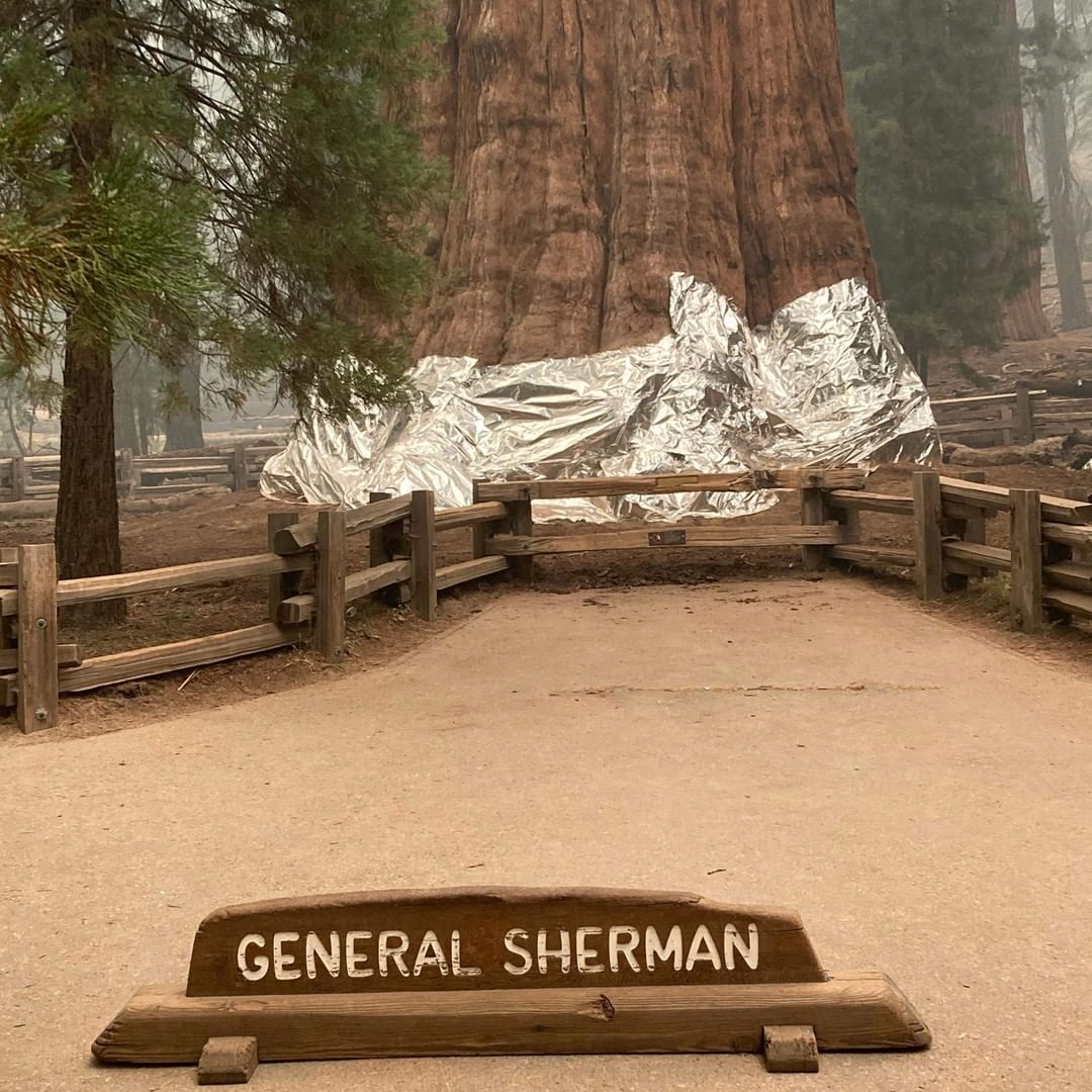 Firefighters wrap the historic General Sherman Tree, estimated to be around 2,300 to 2,700 years old, with fire-proof blankets in Sequoia National Park, California. The world's biggest trees were getting aluminum cladding Thursday in an effort to protect them from huge blazes tearing through the drought-stricken western United States. The 275-foot (83-meter) General Sherman Tree — the largest in the world — is part of this grove of ancient sequoias. Firefighters were also clearing brush and pre-positioning engines among the 2,000 ancient trees in California's Sequoia National Park, incident commanders said. 📸: National Park Service Handout(via @gettyimages) | #sequoianationalpark #generalsherman #generalshermantree #wildfires #westwildfires #firefighters #nationalparks