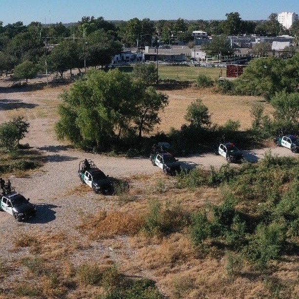 Aerial photos shot by the El Paso Times show about a dozen Mexican State Police vehicles spaced out along a path that runs alongside the Rio Grande near where a surge of Haitian migrants have been crossing into Del Rio.