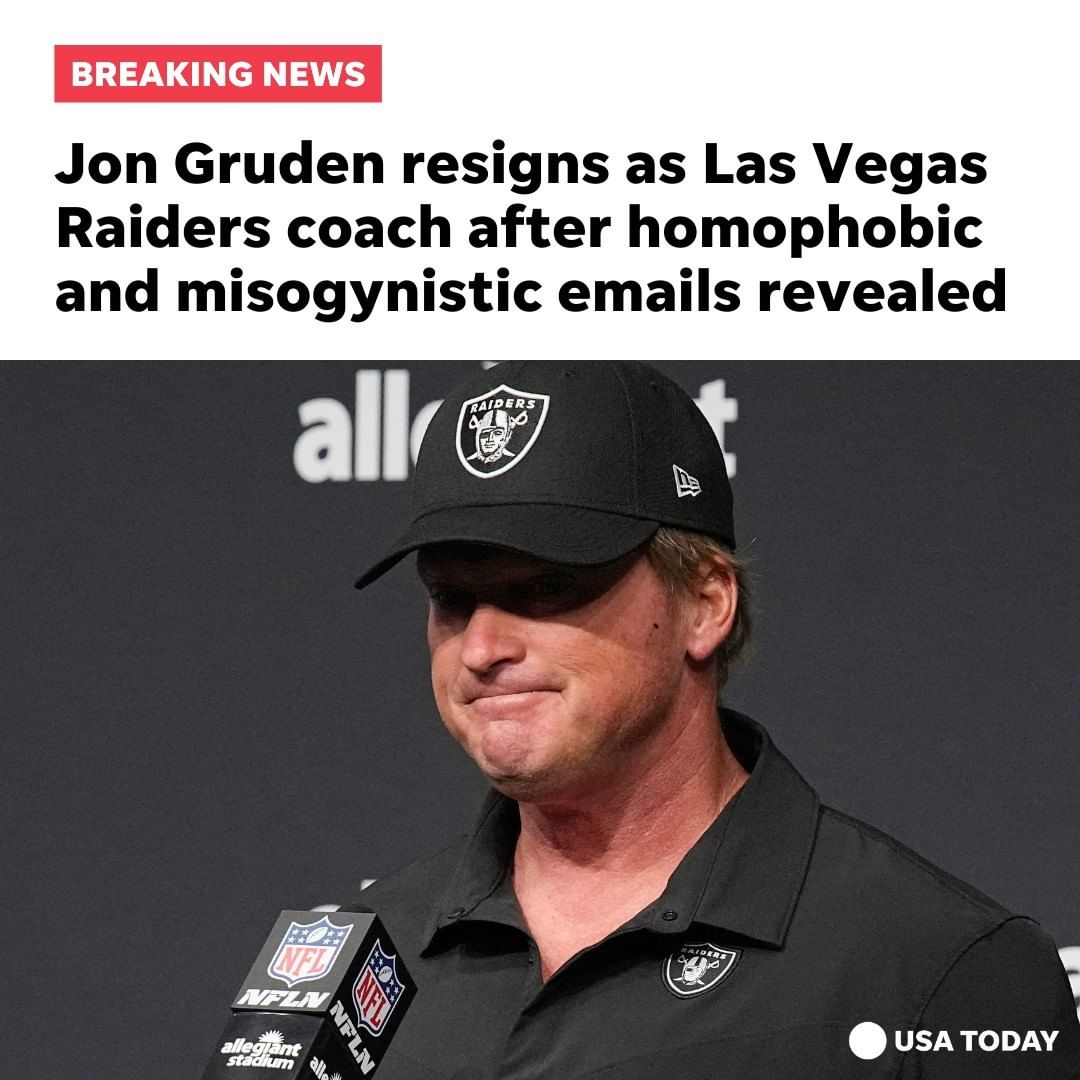 Las Vegas Raiders coach Jon Gruden is resigning after repeatedly using homophobic and misogynistic language in emails sent over a period of seven years and obtained by the NFL as part of an unrelated investigation, according to a report in The New York Times on Monday.