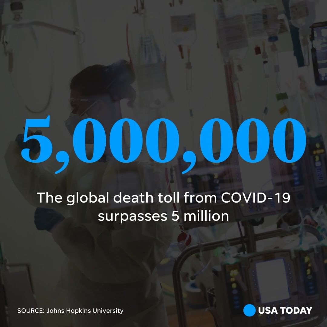 The devastating human toll from the coronavirus reached another major milestone when the worldwide death tally surpassed 5 million, according to Johns Hopkins University data.