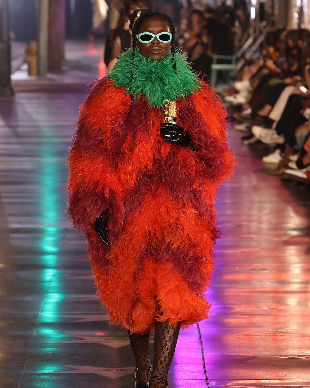 Also walking the runway was British actress Jodie Turner-Smith, who showed off an oversized feathery red number with a green collar. Tap the link in bio to see more pictures of the stars at the show.