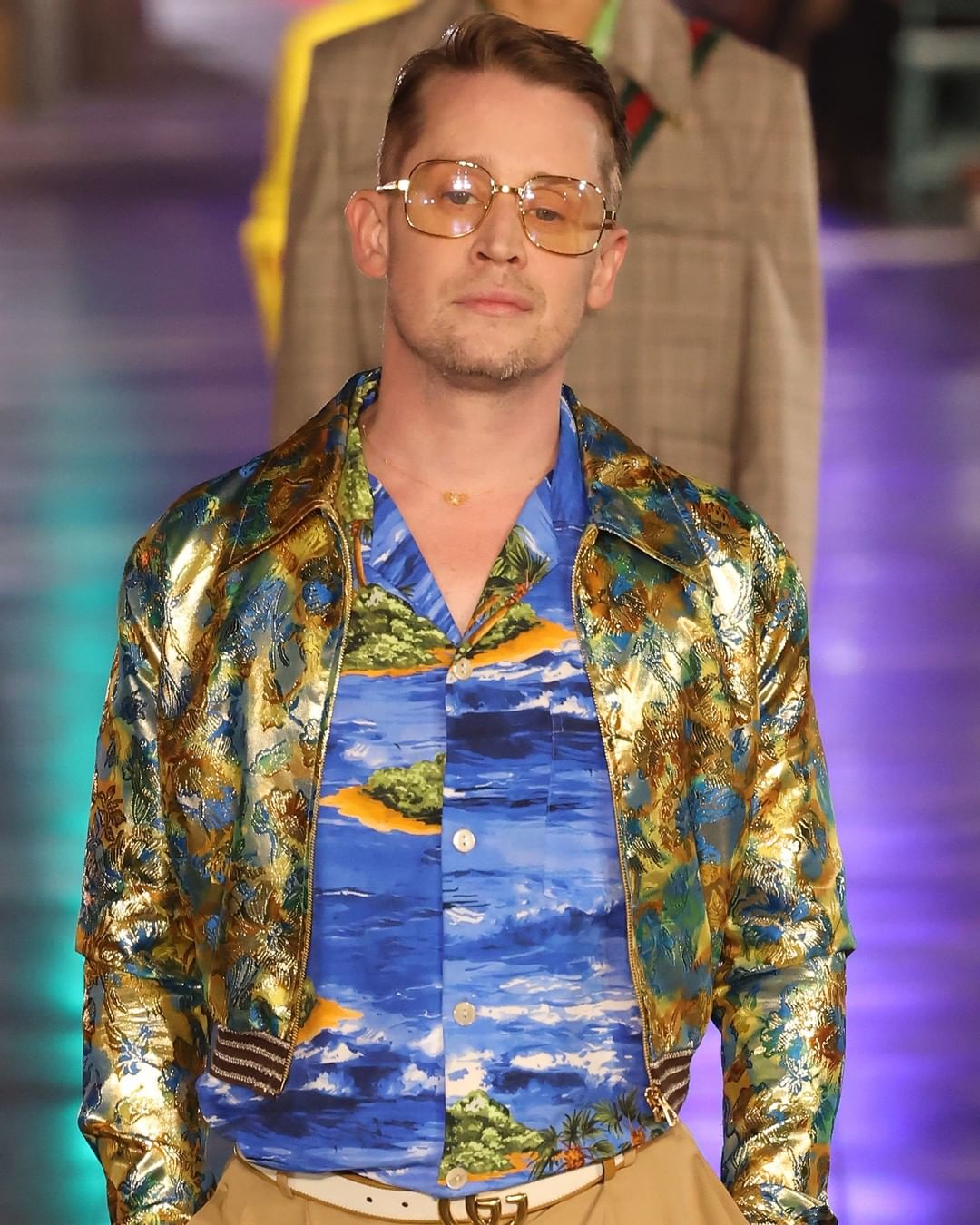 Actor Macaulay Culkin wore a colorful jacket with a blue Hawaiian-style shirt, brown slacks and a white Gucci belt. He was joined on the runway by Jared Leto, who drew applause in a double-breasted blazer, white pants and white boots.