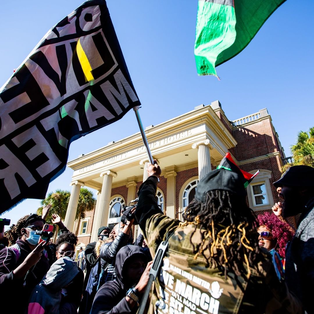The courthouse was surrounded by media and supporters holding signs that say "justice for Ahmaud" and bearing the image of him smiling in a baseball cap. The crowd chanted Arbery’s name and "no justice, no peace."