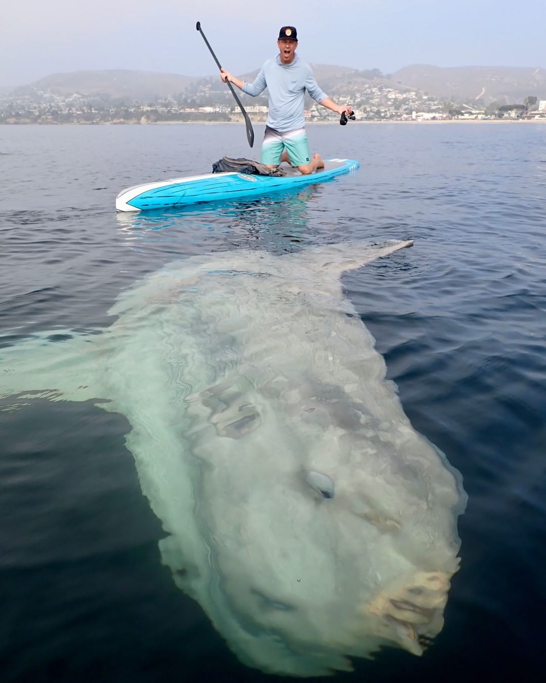 A man looking for dolphins at a California beach was in for a surprise when he paddled near a massive fish that looked like "it was bitten in half."