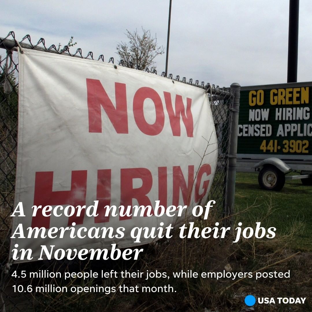 The number of workers quitting jobs vaulted to 4.5 million from 4.2 million, above the prior record of 4.4 million, the Labor Department said. That means 3% of workers voluntarily left their positions, matching September's record high. And for the sixth straight month, job openings also topped 10 million.