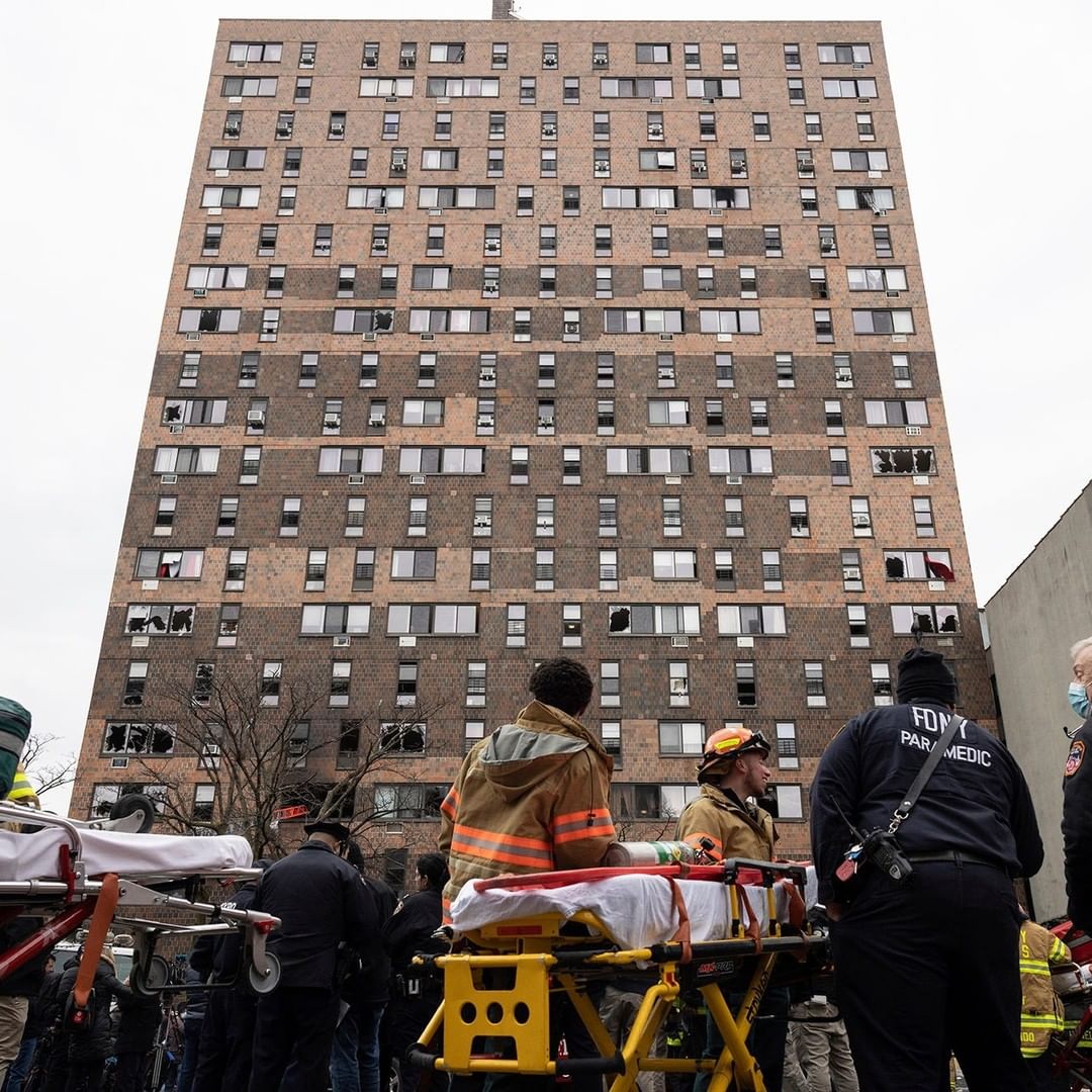 Emergency first responders react to a five-alarm fire that left at least 19 people, including nine children, dead and dozens injured at a Bronx apartment complex in New York City on Sunday, the city's deadliest blaze in more than 30 years.