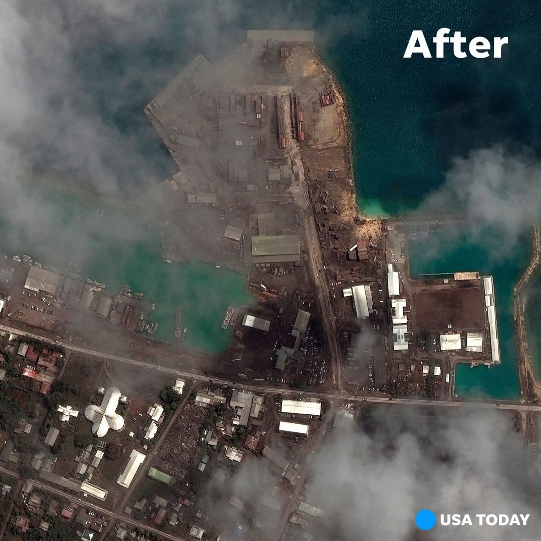 A thick layer of volcanic ash blanketed Tonga in new images showing the aftermath of Saturday's massive undersea volcanic eruption and tsunami that sparked fears of widespread disaster. Aerial and satellite photos released by New Zealand, Australia and UNOSAT, the United Nations satellite center, show once green, lush islands smothered in dark ash. Water from large waves that crashed ashore after the eruption can also be seen, alongside wrecked buildings. These stunning satellite images show the eruption of the Hunga Tonga Hunga Ha’apai volcano, which propelled a 3-mile-wide plume of ash and gas resembling a giant mushroom to about 12 miles above the water. Tsunami waves resulting from the explosion sent people rushing to higher ground, and the eruption disrupted communication with the small island nation over the weekend. Yet Tonga avoided the widespread disaster many had feared, and tsunami waves rose only to about 2.7 feet. Tonga has reported two deaths, but concerns remain over the impact on two smaller islands as fractured communication continues. Swipe to see the before/after images depicting the impact of the eruption, and tap our link in bio to read more! 📷: Getty Images, AP, Planet Labs, Maxar Technologies via AP