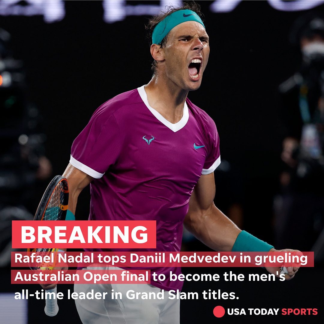 Rafael Nadal is on top of the men's all-time standings after a five-set Australian Open final against Daniil Medvedev. Nadal lost the first two sets before rallying to win the last three for his record-setting 21st Grand Slam men's singles title.