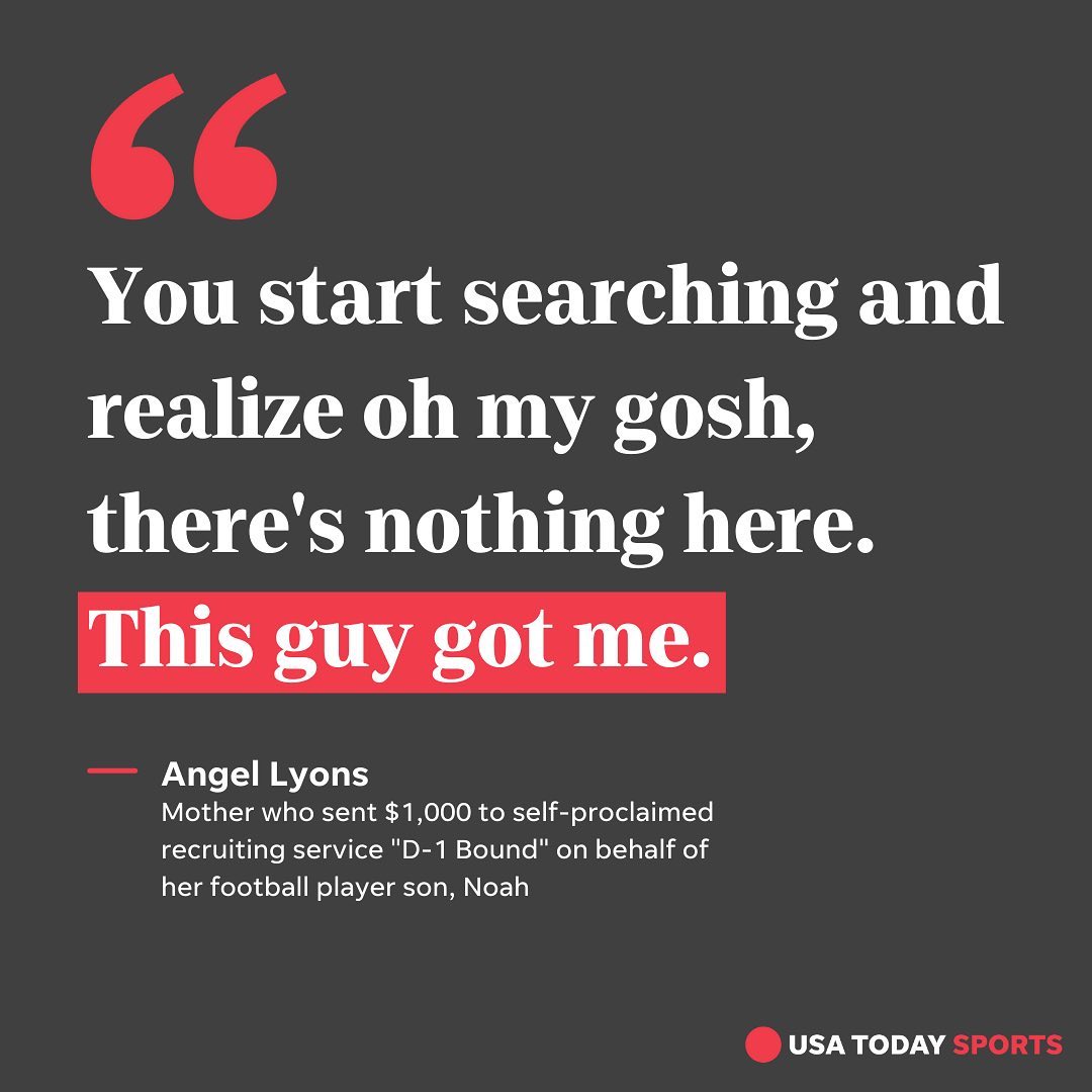 "All these kids, they're just trying to get a scholarship somewhere,” said Angel Lyons, who sent $1,000 to D-1 Bound in October on behalf of her son Noah, a football player. “And he’s out here playing with these kids’ futures, taking their money.”