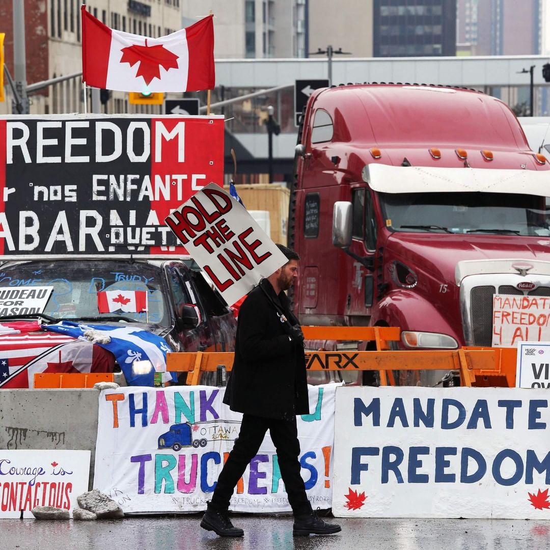 Some sang the Canadian national anthem as a man waved a Canadian flag attached to a hockey stick. The word "Freedom" was written on the flag.