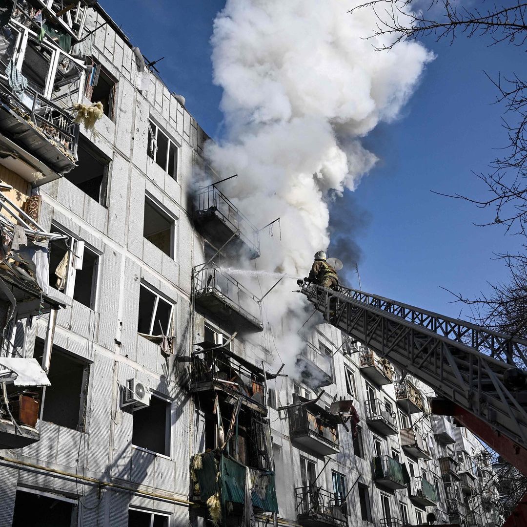 Scenes in Kyiv show destructed buildings and people injured, with many attempting to leave via metros and cars. Families are seen with bags and suitcases at metro stations, and a jam packed traffic lineup can be seen leaving the city, while Ukrainian military vehicles are seen taking up the street in central Kyiv.