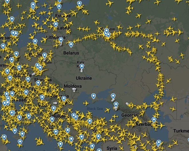 This map shows commercial flights avoiding Ukrainian airspace on Feb. 24, the day after Russian forces invaded. Both Ukraine and neighboring Moldova have closed their airspace.