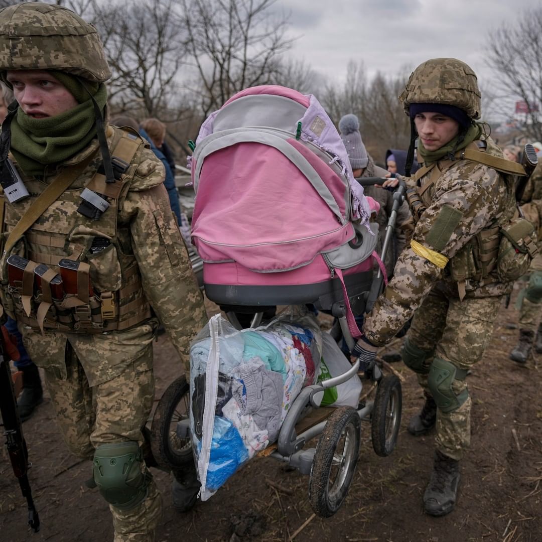 In this photo, Ukrainian servicemen carry a baby stroller while assisting people fleeing the town of Irpin, Ukraine, on Saturday, March 5.