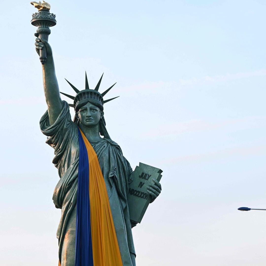 A replica of the Statue of Liberty in Colmar, France, is covered with a giant fabric bearing the national colors of Ukraine — a show of support following the Russian invasion of the country.