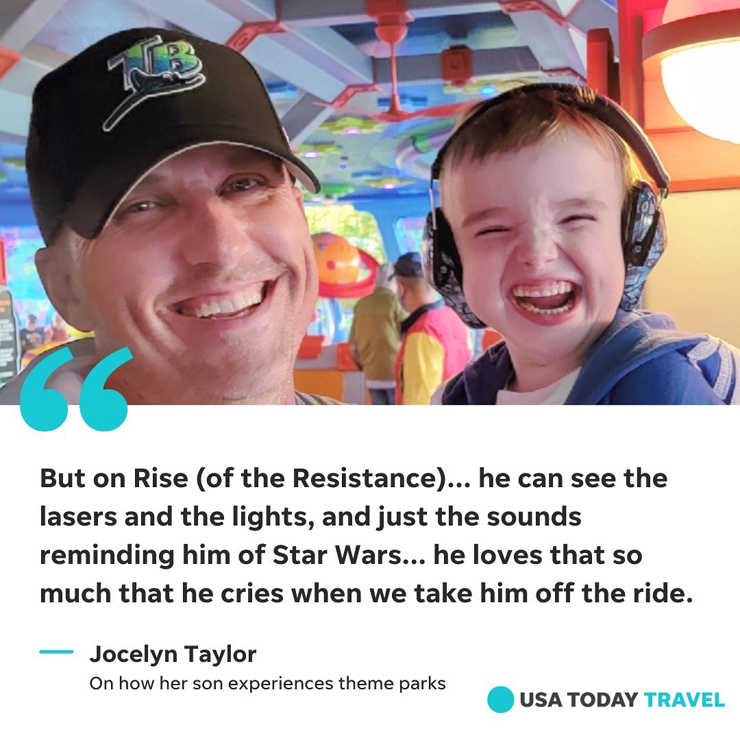 Jocelyn says it's worth the extra prep it takes to see Raylan twirling happily and smiling on the Alien Swirling Saucers at Walt Disney World's Hollywood Studios. Or crying at the end of a ride on the Seven Dwarfs Mine Train roller coaster or a trek on Rise of the Resistance – he's a big Star Wars fan.