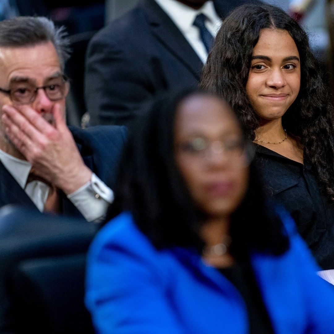 Leila Jackson, right, watches as her parents Dr. Patrick Jackson, left, and Supreme Court nominee Ketanji Brown Jackson, foreground, get emotional during a back and forth with Sen. Alex Padilla, D-Calif., during Jackson's Senate Judiciary Committee confirmation hearing on Capitol Hill in Washington, on Wednesday, March 23, 2022.