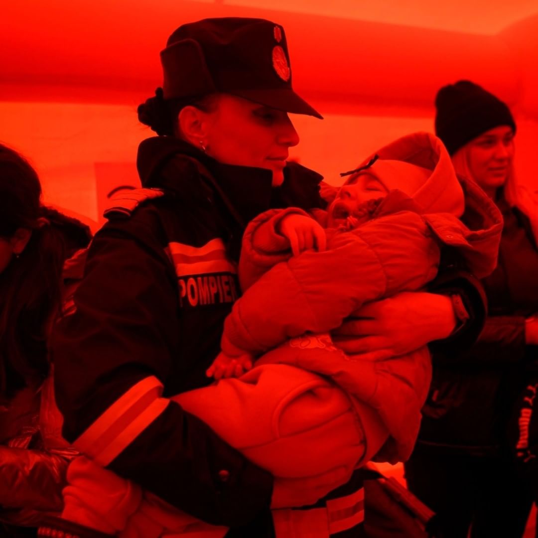 A firefighter holds the child of a refugee fleeing the war from neighbouring Ukraine as they wait to be processed by border police after crossing the Isaccea-Orlivka border crossing in Romania.
