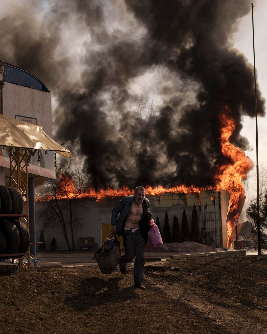 A man recovers items from a burning shop following a Russian attack in Kharkiv, Ukraine.