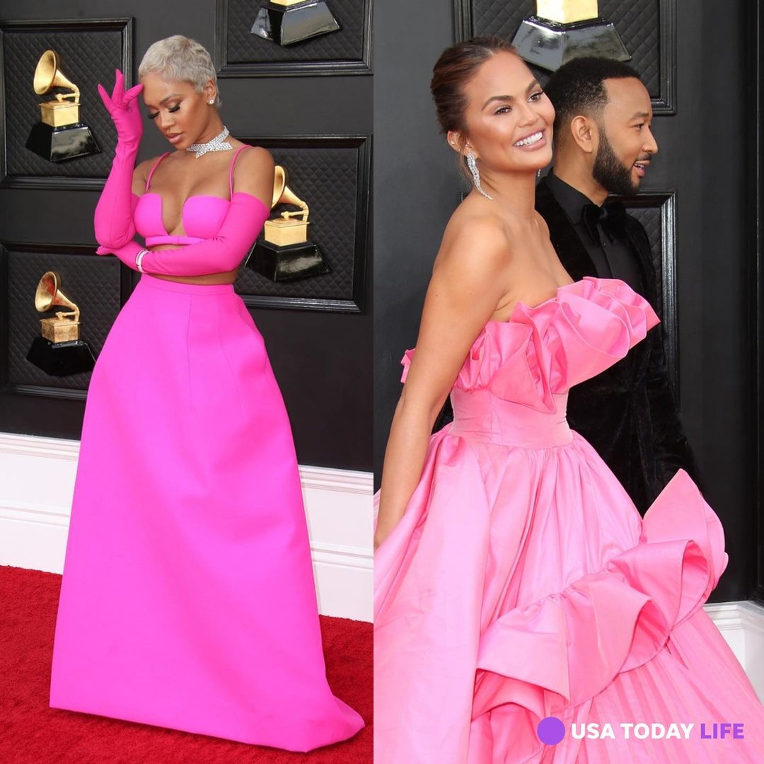 💖 The Wiz obviously set the color to hot pink for tonight's #Grammys ⏩ SWIPE! 🎀 @chrissyteigen, @justinbieber, @saweetie and @tinashenow all showed up on theme in the poppin' bright hue. From beanies to dresses to opera gloves and more pink was ON the red carpet. Head over to the link in bio to see more red carpet looks. 📸: Dan MacMedan, @USATODAY; Amy Sussman, @GettyImages #Grammys #hotpink #Saweetie