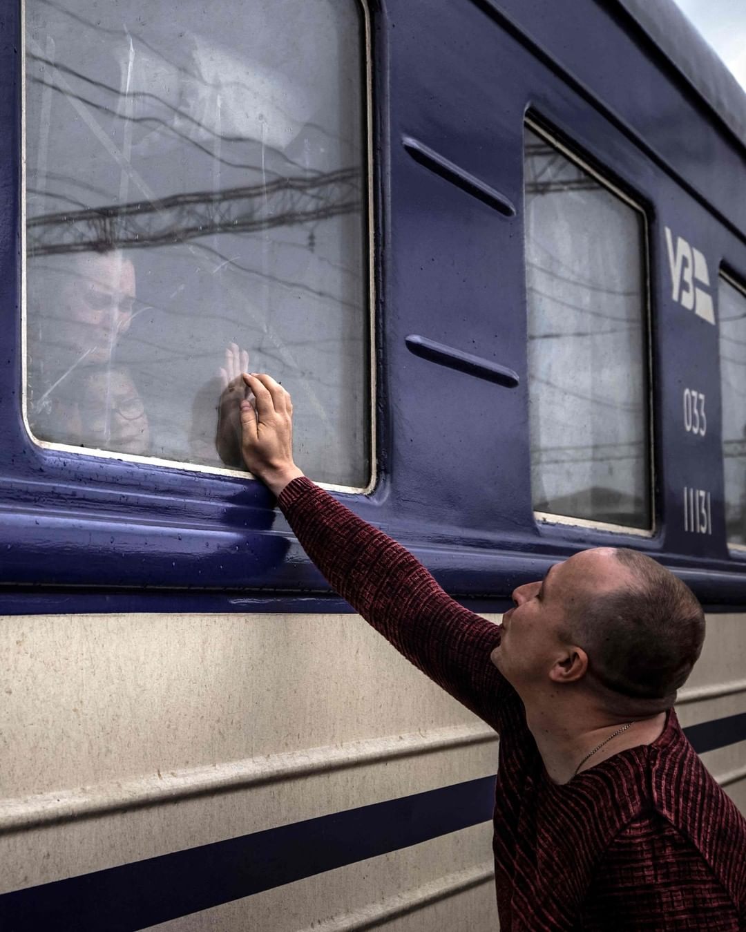 Saying goodbye. In an emotional moment, a man touches the window of a train carrying loved ones before it leaves the eastern city of Kramatorsk, Ukraine. 📸 Fadel Senna, AFP via Getty Images
