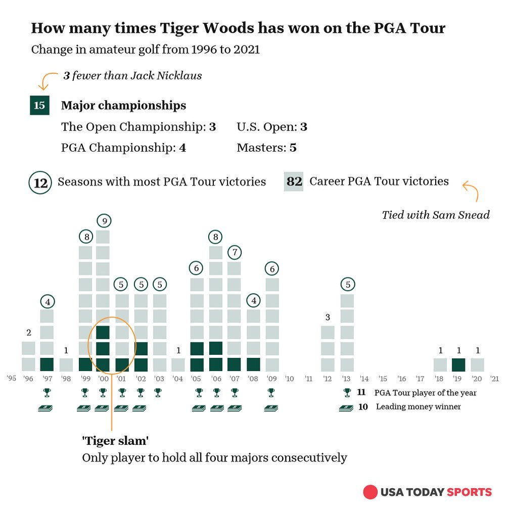 It’s been 25 years since 21-year-old Tiger Woods won the 1997 Masters by 12 shots and became the first man of color to win at Augusta National Golf Club. As he prepares to return this year from his February 2021 car crash, the tournament and its TV ratings can likely expect another jolt of interest from golf fans. Draw a line at that 1997 victory, and you can see in these charts how the "Tiger Woods effect" has changed the Masters, the PGA Tour and golf. For more on Tiger’s return, visit the link in our bio.