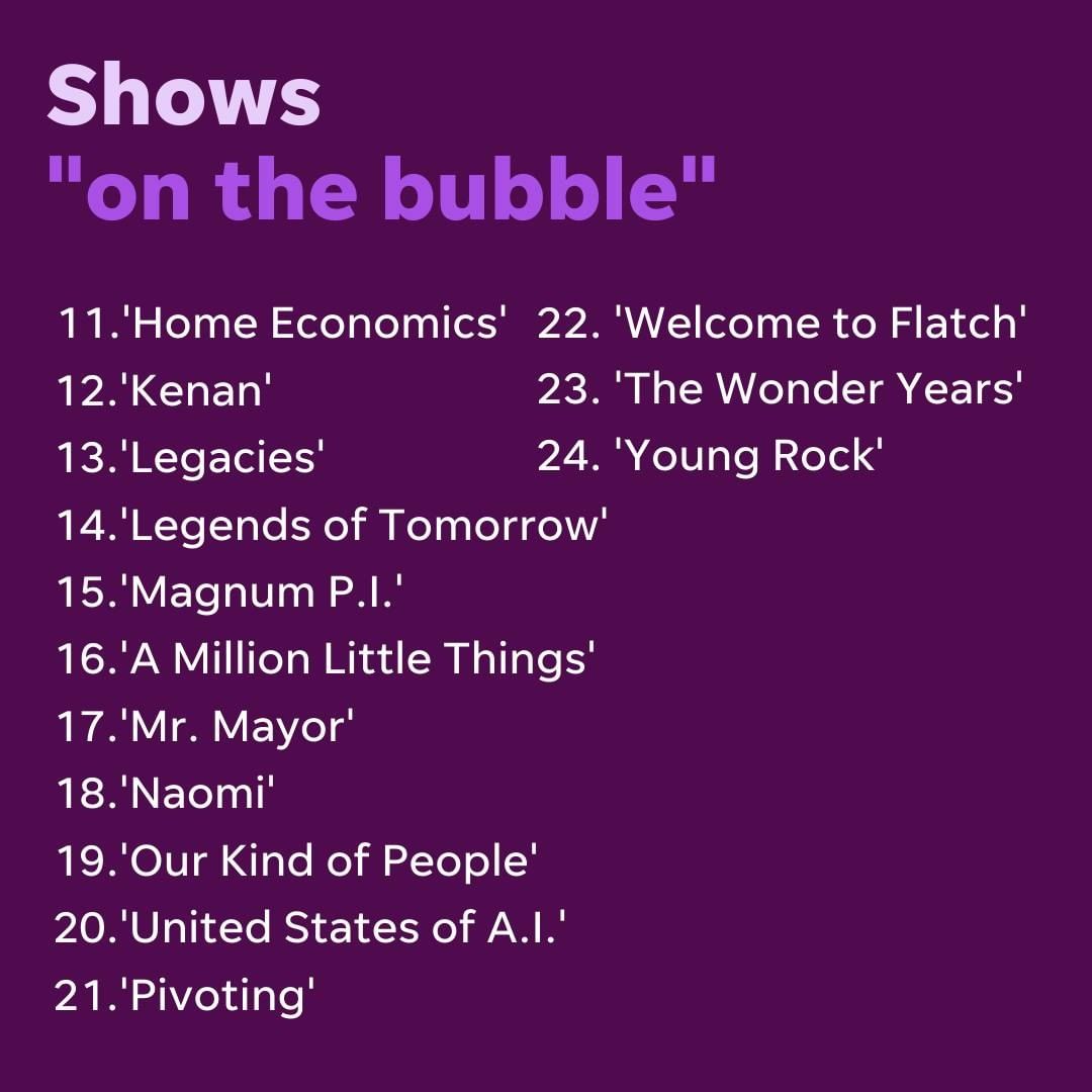 This year 24 shows are among this year's crop of endangered network series. ABC's remake of "The Wonder Years"; CBS' "Magnum P.I."; all of NBC's comedies, including "Kenan" and "Young Rock" are all on the list again as they face the bubble of cancellation or renewal.