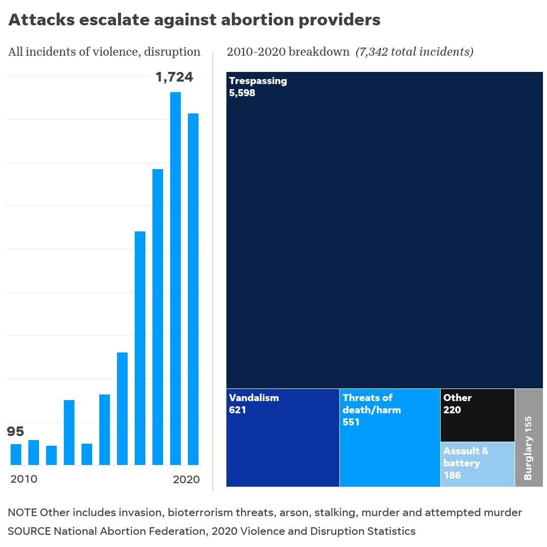 While murders connected to clinics have become less common, other types of violence has been rising, according to @nationalabortionfederation, including trespassing and obstruction, death threats, and mail and internet harassment.