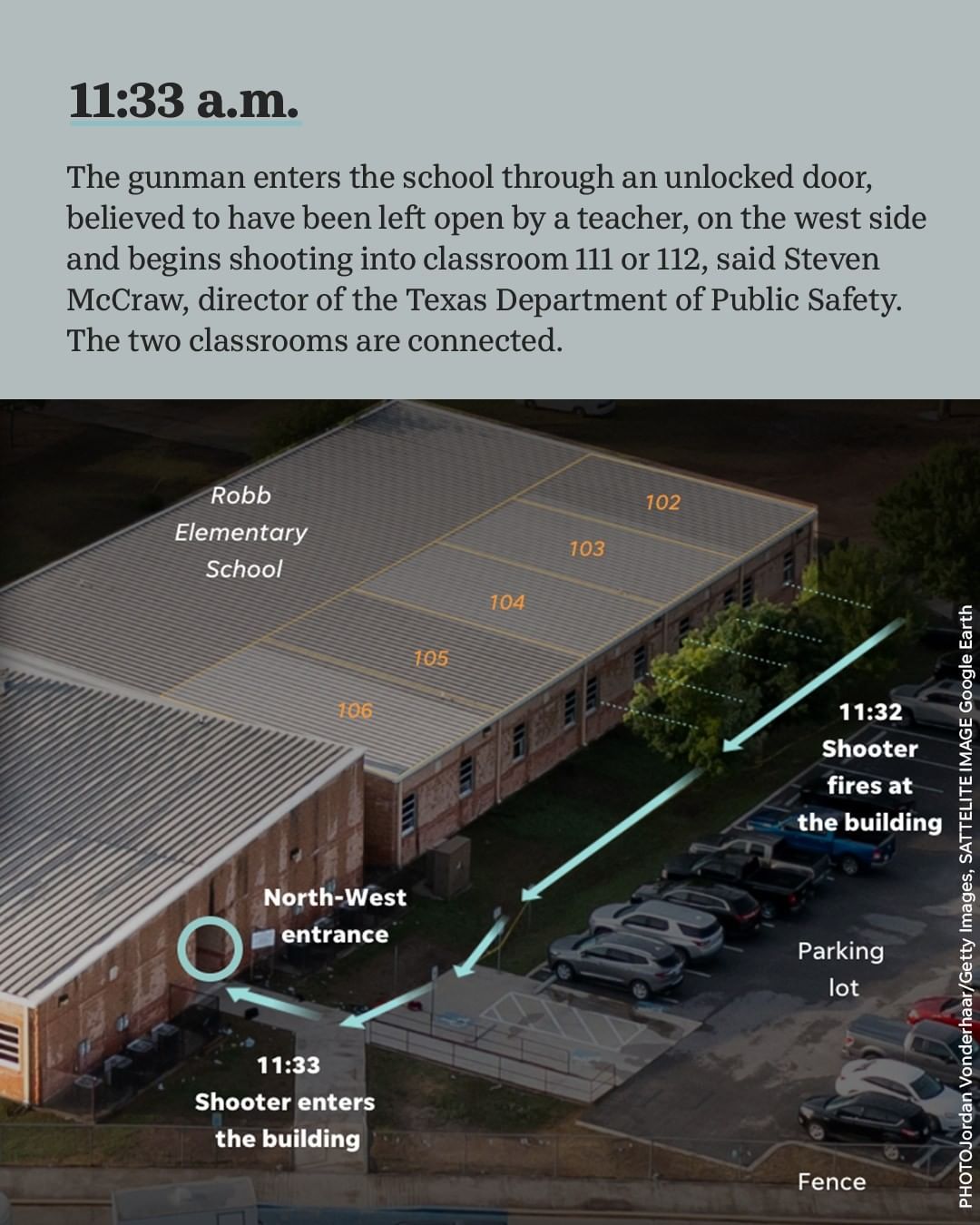 Details continue to emerge about the day of the shooting at a Texas elementary school, including new accounts of how long the gunman was in the building, the time it took police to respond, and how the gunman was killed. The gunman entered the school at 11:33 a.m. Police had about 19 officers in the school at about 12:03 p.m. but did not enter the classroom where the shooter was located and kill him until 12:50 p.m., said Steven McCraw, director of the Texas Department of Public Safety, in a news conference Friday. Swipe right to see the timeline of the hour in which the shooter arrived at the school. Click the link in our bio to see the full timeline. USA TODAY is providing general details about the shooter to inform how mass attacks are often planned and carried out, particularly with respect to how weapons and targets are selected. These details give authorities and the public information that could help citizens spot future mass shooters and even prevent them.