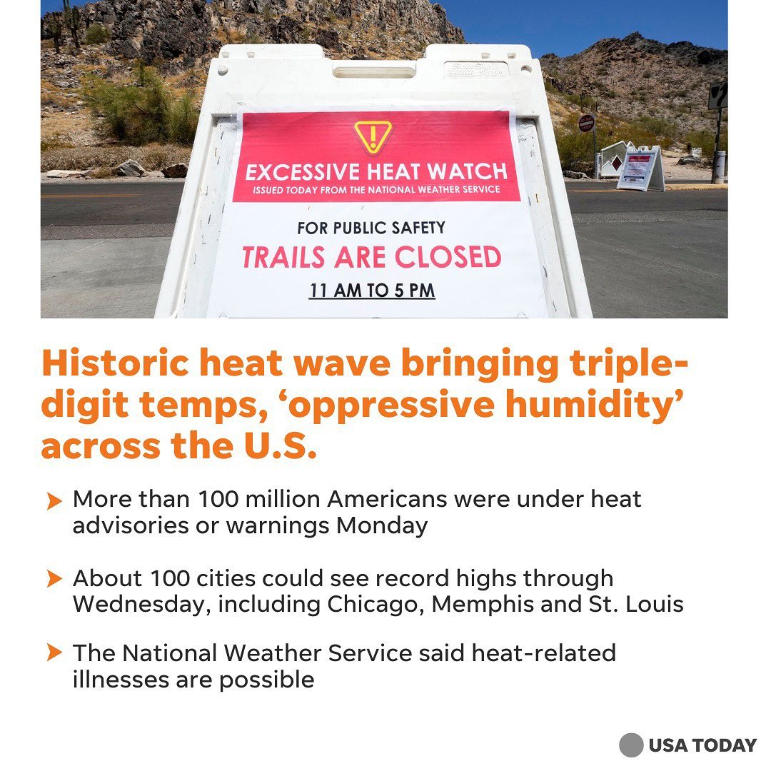 More than 100 million Americans were under some form of heat warning or advisory Monday as a withering, potentially record-breaking heat wave made its way toward the central and eastern USA. The heat moved east after scorching portions of the West late last week and over the weekend. Phoenix, Las Vegas and Denver were among cities posting record temperatures. Swipe through to learn more. Click the link in our bio for more weather updates.