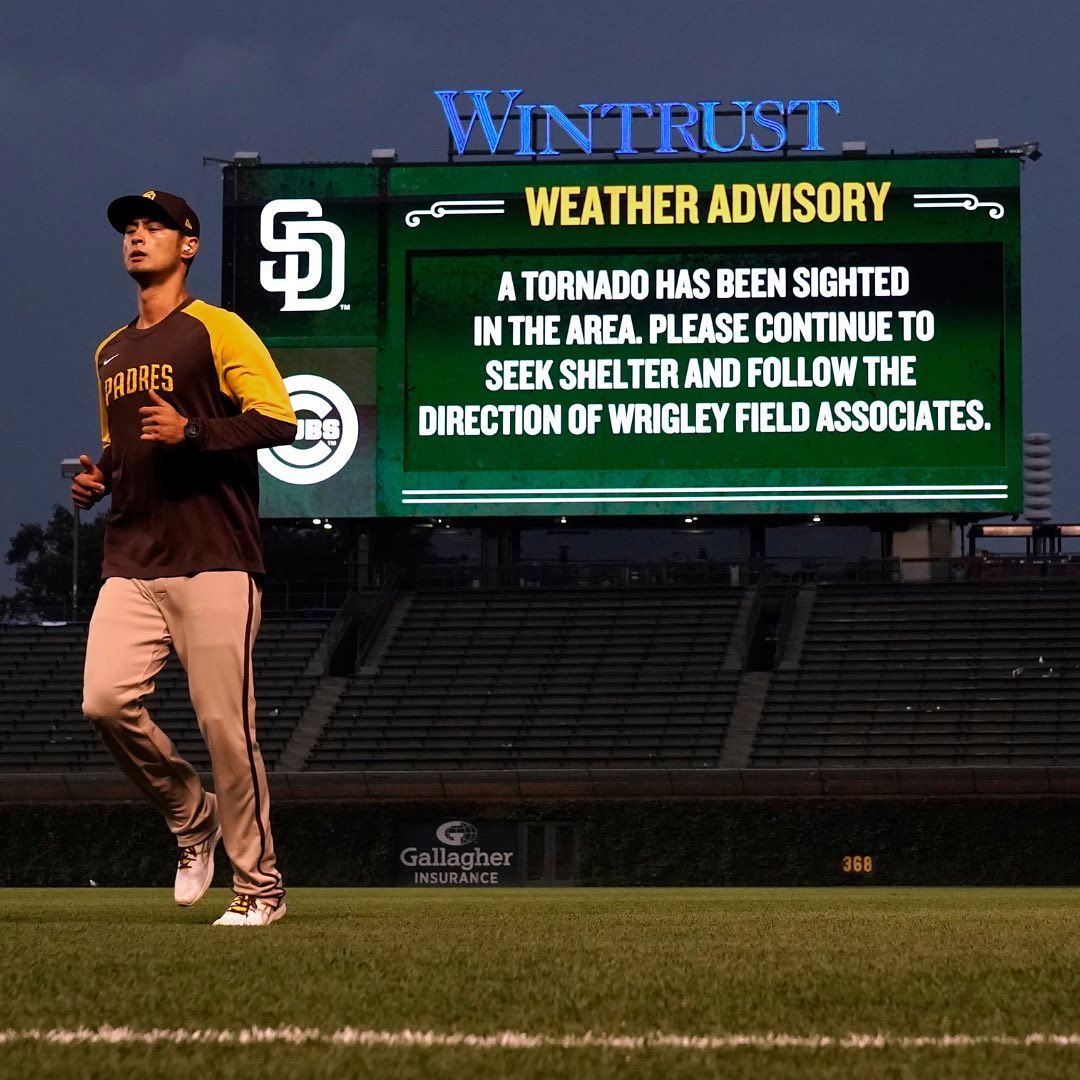 San Diego Padres starting pitcher Yu Darvish cut his pregame workout short Monday as a storm that has spawned a tornado warning descends upon Wrigley Field in Chicago before the Chicago Cubs hosted the Padres. The game went on to be played and the Padres bet the Cubs 4-1.