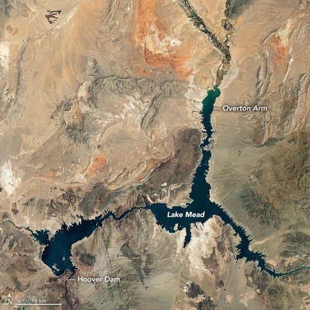 Satellite images released by NASA this week show a dramatic drop in water levels over the last 22 years at Lake Mead. The photos shared by the NASA Earth Observatory, taken in 2000, 2021 and 2022, show Lake Mead appearing to grow less and less full of water, even in the one-year span between 2021 and 2022. The image from 2000 shows swaths of Lake Mead full of water, while the image from 2022 only shows one section, known as Overton Arm, filled. Learn more about the shrinking of Lake Mead in the link in our bio