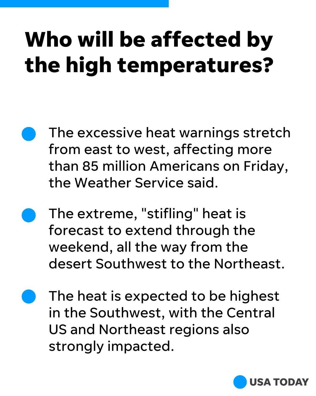 The National Weather Service said the "dangerous heat" would impact a large swath of the country. The Weather Service is advising people to take extra care during the high temperatures.