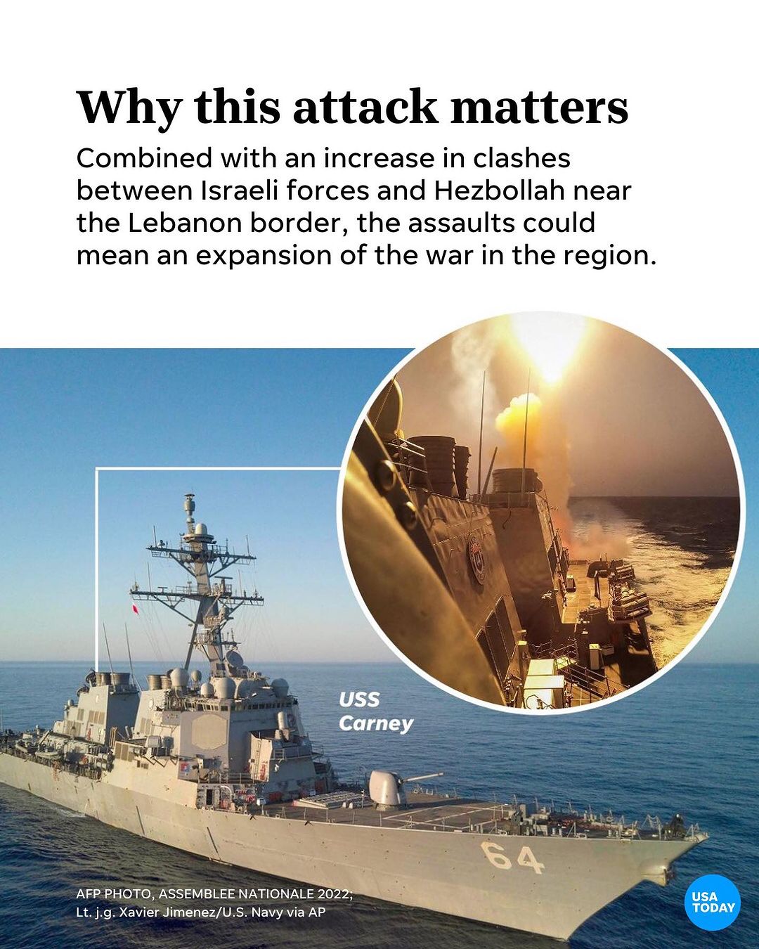The Navy destroyer USS Carney shot down three drones launched by Iran-backed Houthi rebels in Yemen during ballistic missile attacks on three commercial ships in the Red Sea Sunday. The attacks took place in international waters over seven hours. The Houthis claimed responsibility for two of the attacks against the commercial ships, but said nothing about the Navy ship. The USS Carney is part of the USS Gerald R. Ford aircraft carrier strike group. It was dispatched to the Middle East along with the strike group in October. Tap the link in our bio to learn more about how the attack unfolded.