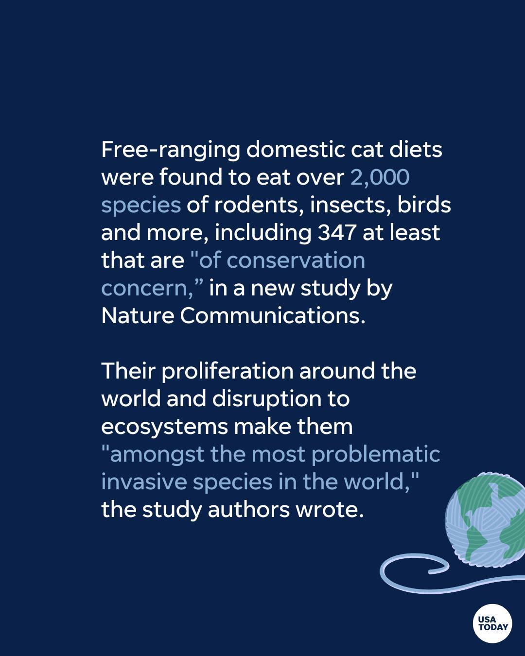 A study published this week in Nature Communications examined the global impact of free-ranging domestic cats' diets and found they eat more than 2,000 species of rodents, insects, birds and more, including at least 347 that are "of conservation concern."