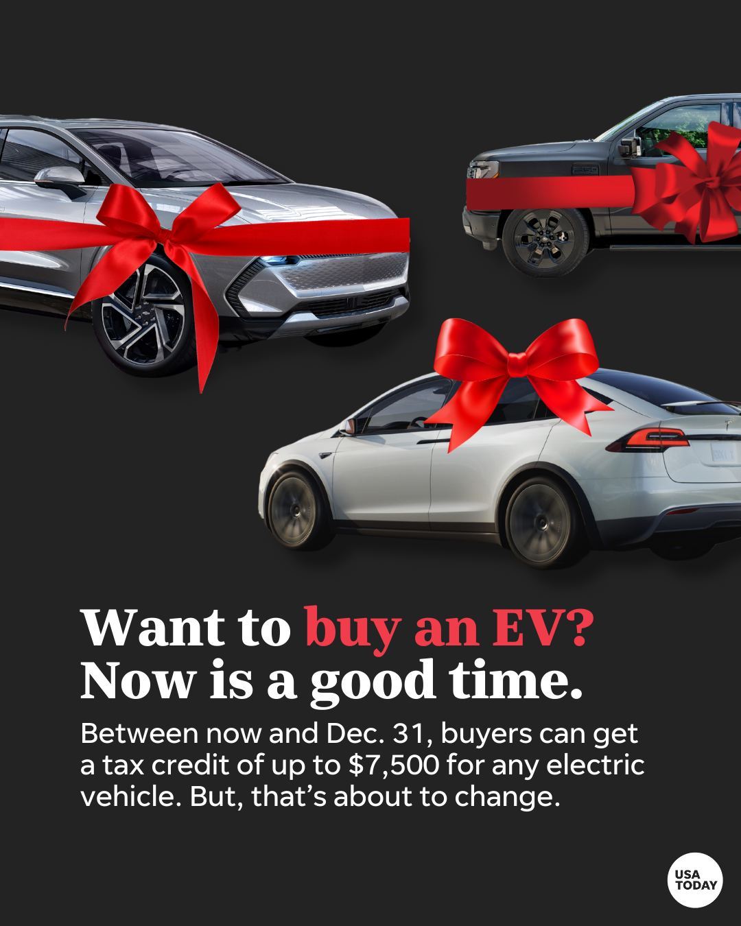 Between now and Dec. 31, buyers get an EV tax credit of up to $7,500 on the vehicle and the widest selection of models eligible for the full credit.