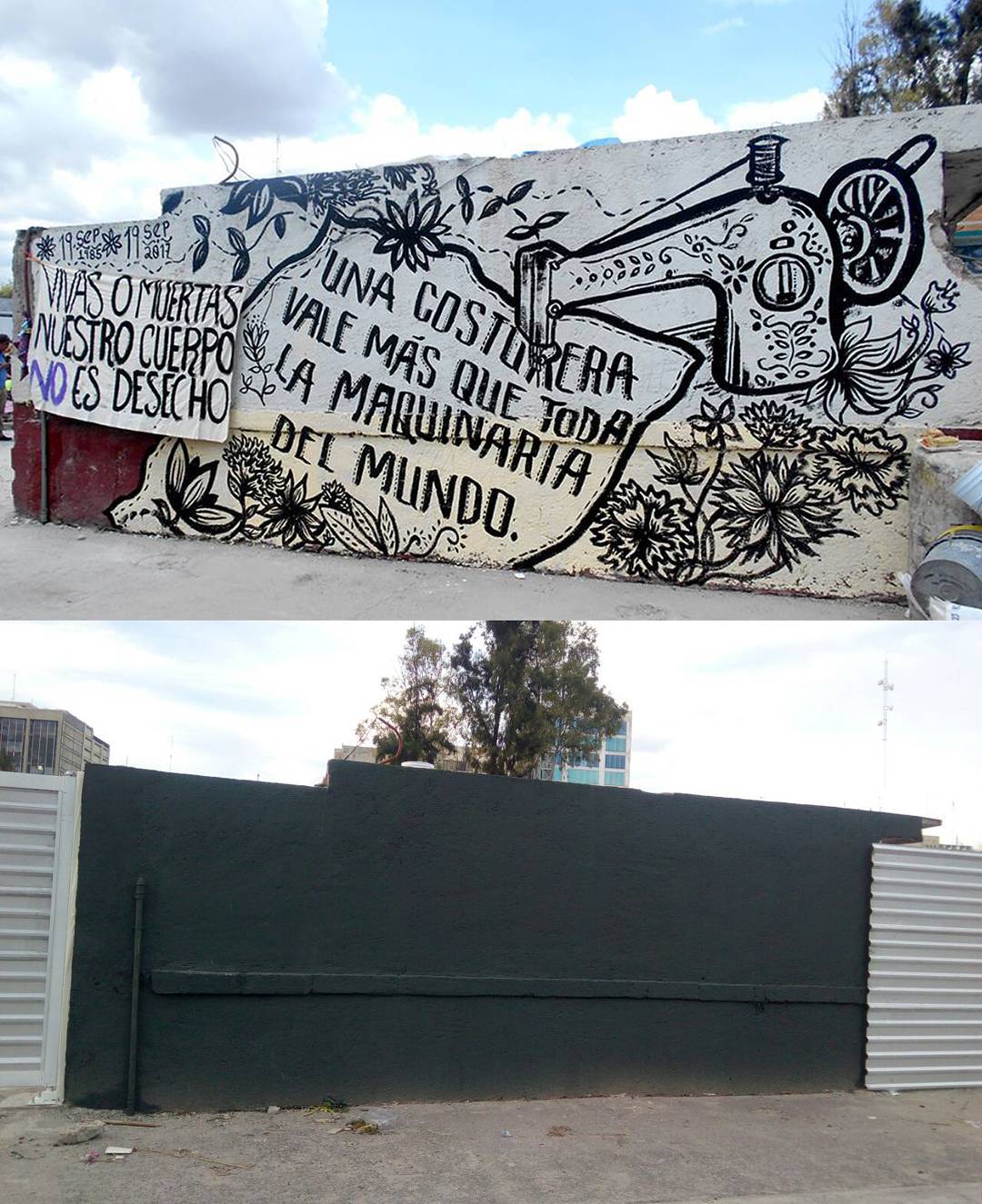 Denunciamos al gobierno de la Cdmx por el intentó de borrar las huellas de corrupción sobré las que esta construida esta ciudad. Por retirar el altar en el que se había convertido el mural en la calle de Chimalpopoca, donde familiares y vecinxs se congregaban para colocar veladoras y hacer oración a sus difuntxs, haciendo gala de su falta de sensibilidad. En este edificio trabajaban en su mayoria mujeres y al momento de su colapsado el 19s funcionaba en condiciones laborales irregulares, además de estar catalogado como inmueble de alto riesgo poniendo en evidencia la complicidad entre empresarios y gobierno para su funcionamiento. Otro motivó de la censura del mural, es la creciente organización de vecinos y colectivxs que se reúnen a su costado para denunciar y hacer memoria de lo ocurrido, para tomar talleres y ver documentales donde se nos recuerda las similitudes entre el 19s1985 y el 19s2017, la misma solidaridad de la población, pero también la misma corrupción de las autoridades, la misma prepotencia y saqueó de las ganas de ayudar, el mismo desprecio por los afectados.