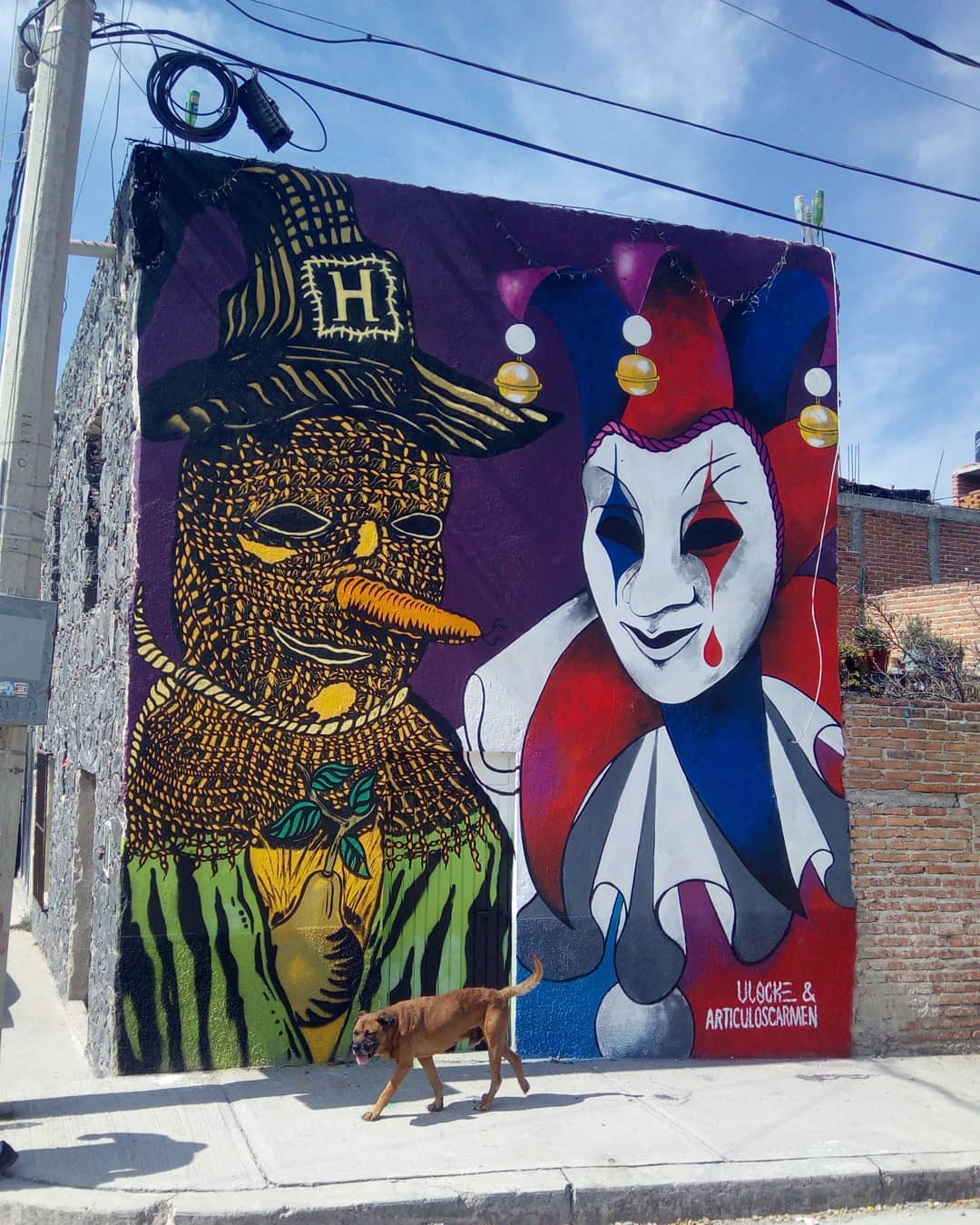 ::Los Locos:: colaboración con @articuloscarmen en San Miguel de Allende, barrio de San Luis Rey, para @nuevearteurbano se trata de disfraces clásico del #festivaldeloslocos, un espanta pájaros hortalero y un arlequín, anterior mente se acostumbró regalar frutos durante este festividad actualmente estos han sido sustituidos por dulces.