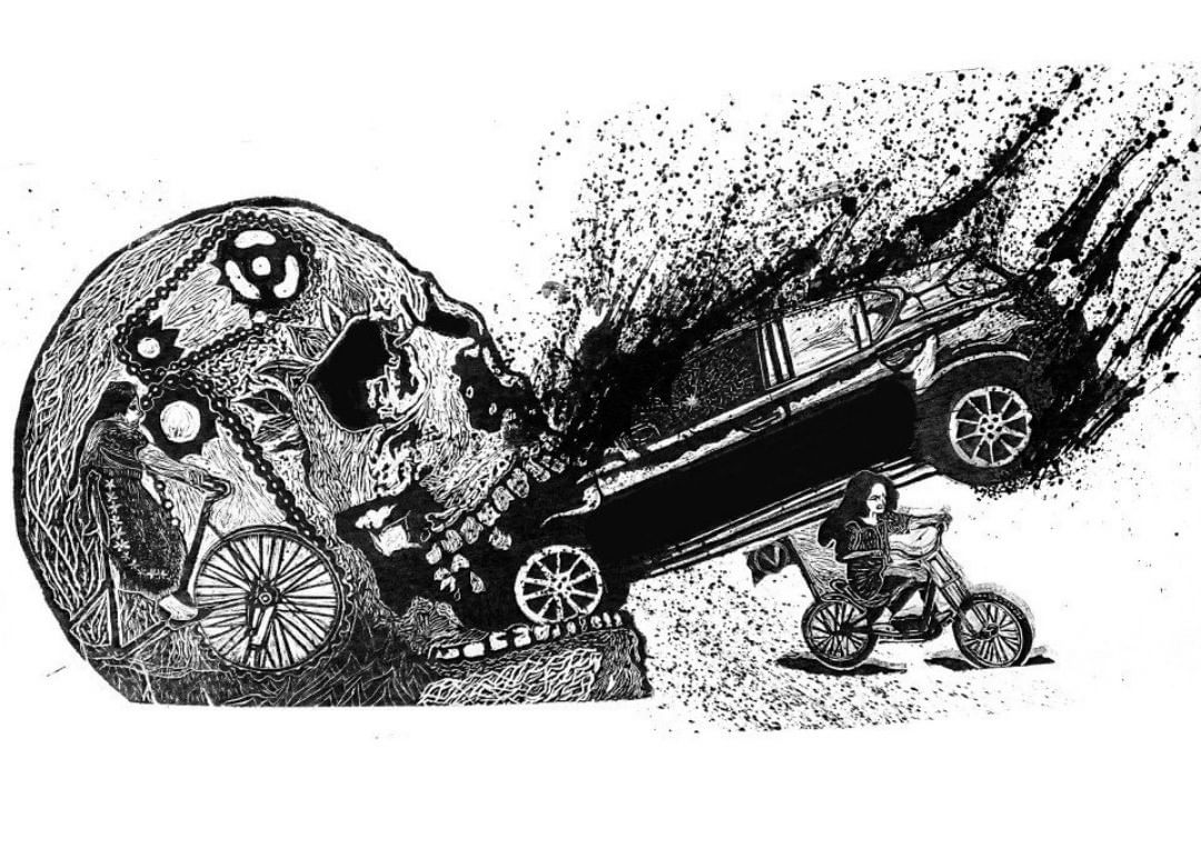 Bicitrituradora de autos. Placa en linoleo y tinta china. #oldwork #vlocke #oaxaca #linocut #linoleumprint #prinmaking