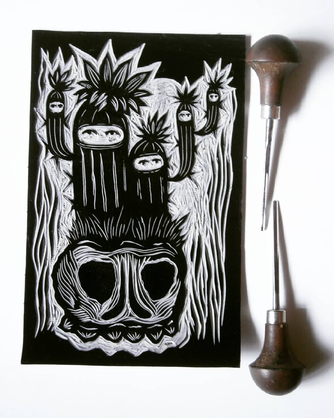 EngaƱando a la muerte y renacer #linocut #prinmaking #miniprint #vlocke #zapacactus #skeleton #cactus #flores #ezln #neozapatistas #chiapas #guerrilla