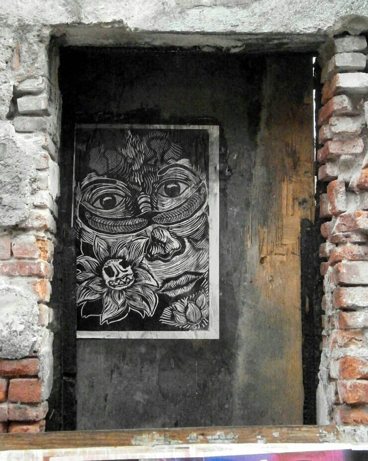 Cerquita de la #arenacoliseo hice aproximadamente 20 copias de este grabado soló para la calle, fuerón impresos con los pies, una vieja técnica de impresión creo que ya no sacaré más, a la siguiente imagen! #vlocke #wheatpasteart #wheatpaste #pasteup #woodcut #prinmaking #grabadomexicano #grabado #pegas #streetartcdmx #globalstreetart #arteurbano #graficamural #graficacontemporanea #contemporanyart