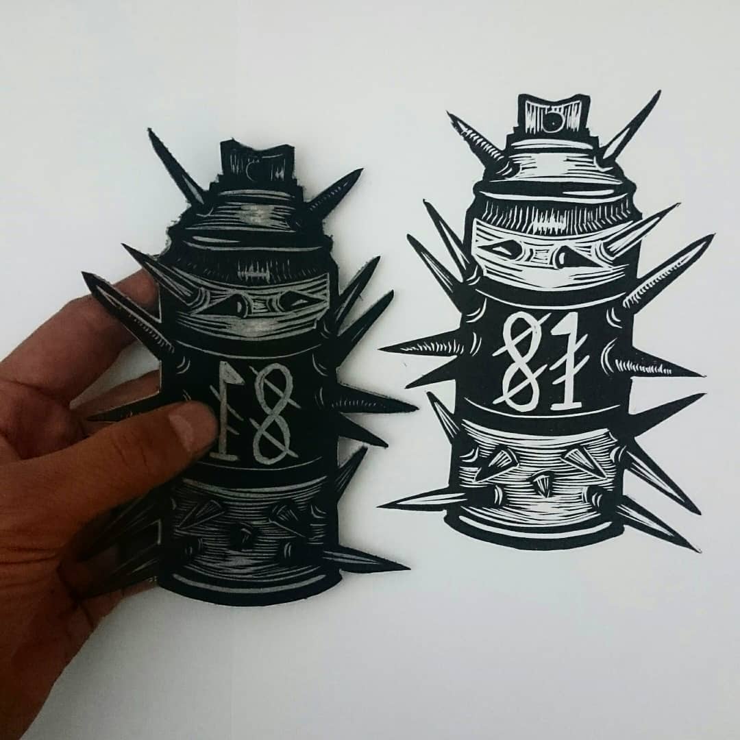 1981 #linocut #grabado #prinmaking #spray #cans #spraycans #lata #espinas #vlocke #pruebas de impresión