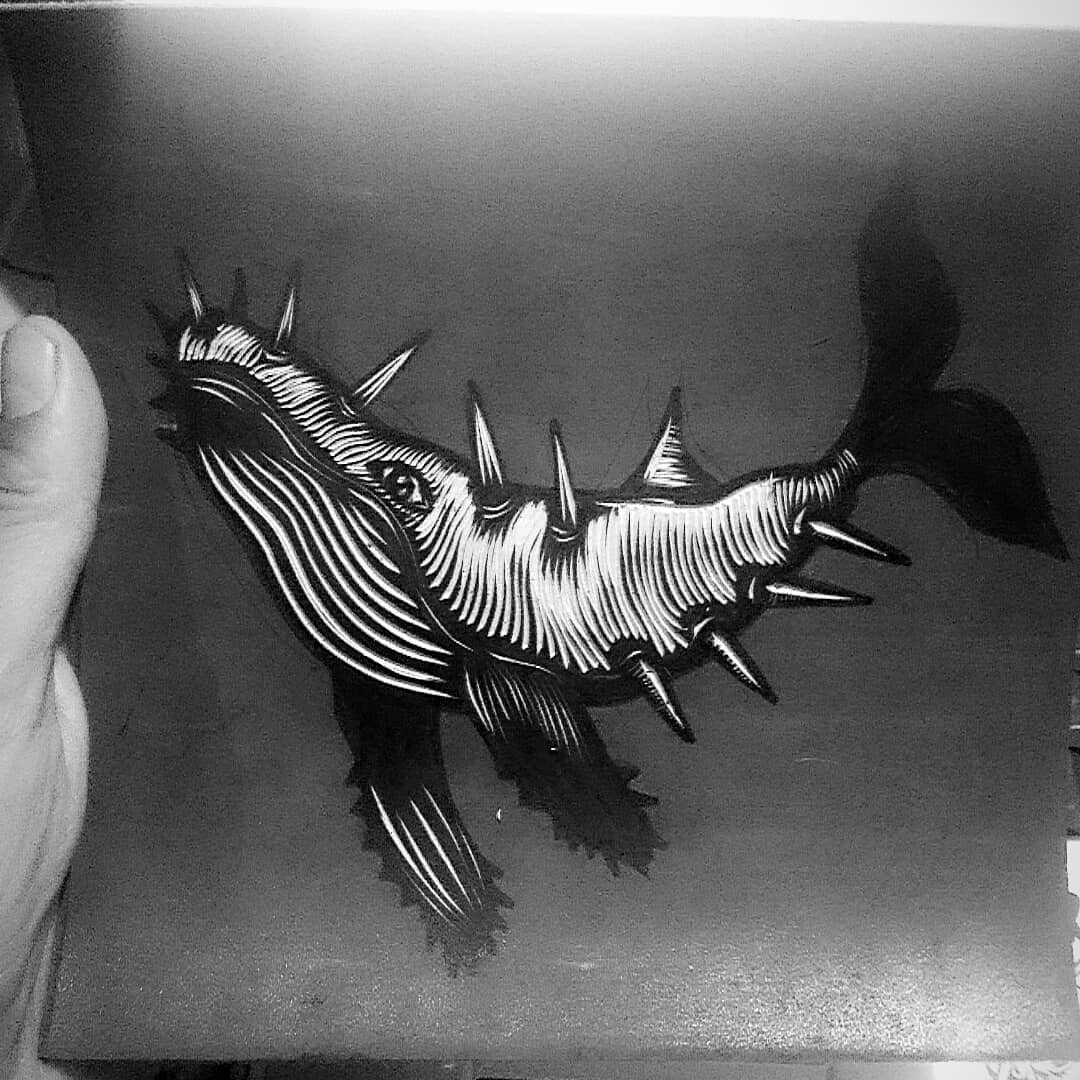 Las espinas como defensas naturales. Del pasteup al Linoleo. #linocut #blockprints #ballenajorobada #espinas proceso #print #prinmaking #taller #laardillamanca #grabado #mar #miniprint