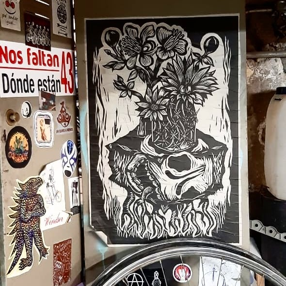 De visita en #enchulamelabici taller comunitario de bicicletas para nuevas colaboraciónes. #graficacontemporanea #grabado #cactus #bikepunk #bici #vlocke #santamaríalarumbera #blockprints #woodcut