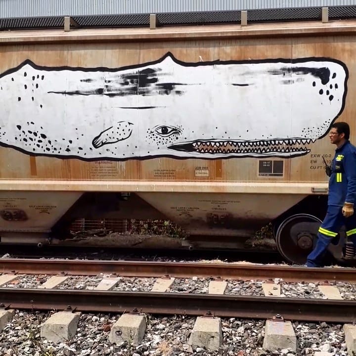 Sigue el viaje de las ballenas migrantes, que los acompaƱe en su viaje. #vlocke #whale #streetart #ballenas #globalstreetart #streetartpunk #streetart #walls #trenmexico #tren #hangares #peinting
