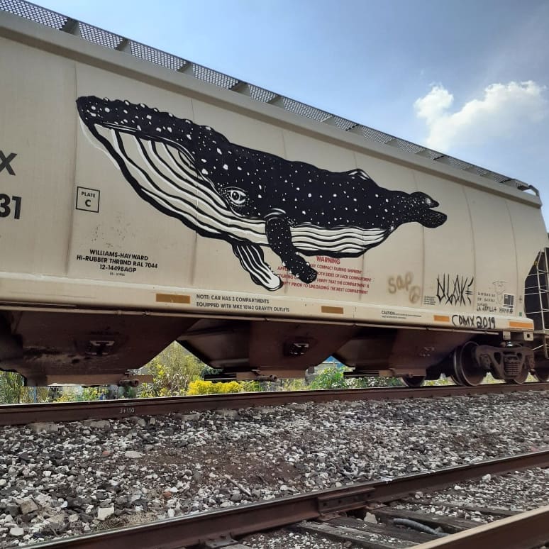 Ballena, de regreso en los bagones. #rollinggraffiti #vlocke #whales #ballenagris #trenmexico #mural #painting #extensor #pinturamural #lamigracionesnatural #ningunhumanoesilegal #ilegalyque