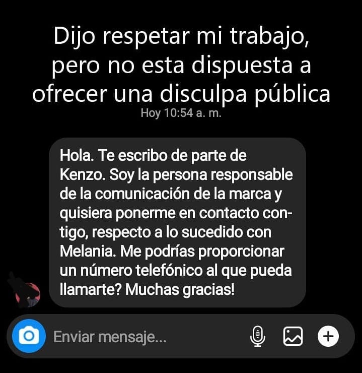 Su abogado me pide retirar mi publicación porque les "estaba causando daño" y que "ya le han jalado las orejas a la influencer”. Pero la publicación estuvo circulando dos meses y una marca internacional como Kenzo, esta obligada a comprobar que cuenta con los derechos de autor necesarios para publicitar su imagen.