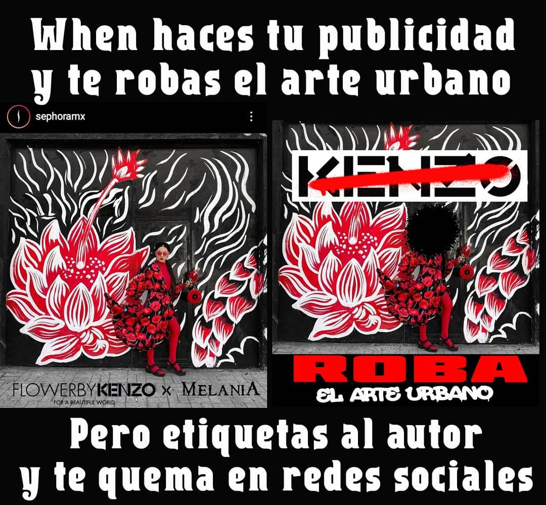 El 28 de octubre del año pasado @kenzoparfums lanza una campaña publicitaria a través de @sephoramx donde comercializan, se apropian y reconceptualizan un mural que realice con mis propios recursos, de la mano de una influencer matching.melania estas empresas pretenden ignorar y pasar por encima del arte urbano y de sus actxres. Esta campaña visibiliza dicho atropello y exige disculpas públicas y retribución por el uso del arte, como una manera de hacer justicia.