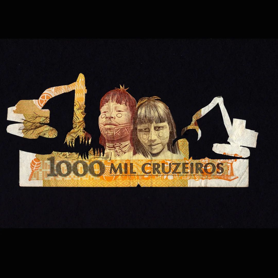 Collage con billete de 1000 mil Cruzeiros fuera de circulación, la pieza muestra a dos mujeres Karajá uno de los pueblos indígenas de Brasil afectados por la mineria.